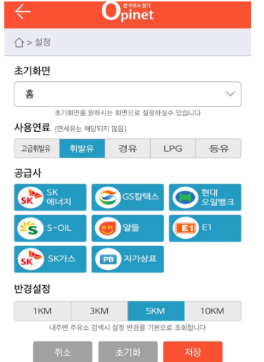 첫째로 유종을 선택하시고 내 주변 주유소 거리를 1Km~10Km까지 변경할 수 있고,